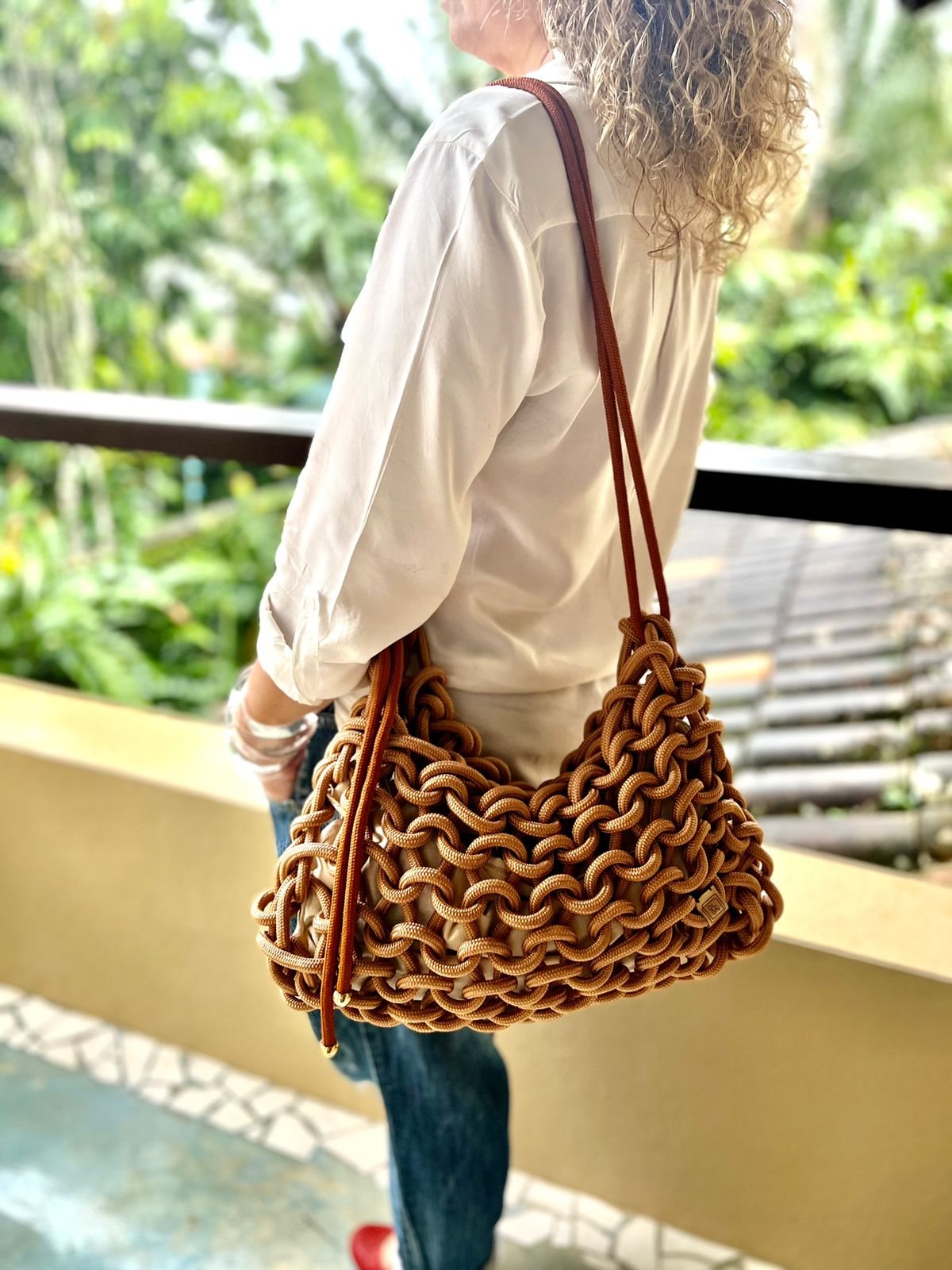 Bolsa Gana caramelo é uma peça versátil, cabendo perfeitamente com um jeans, uma calça de alfaiataria ou um vestido casual.