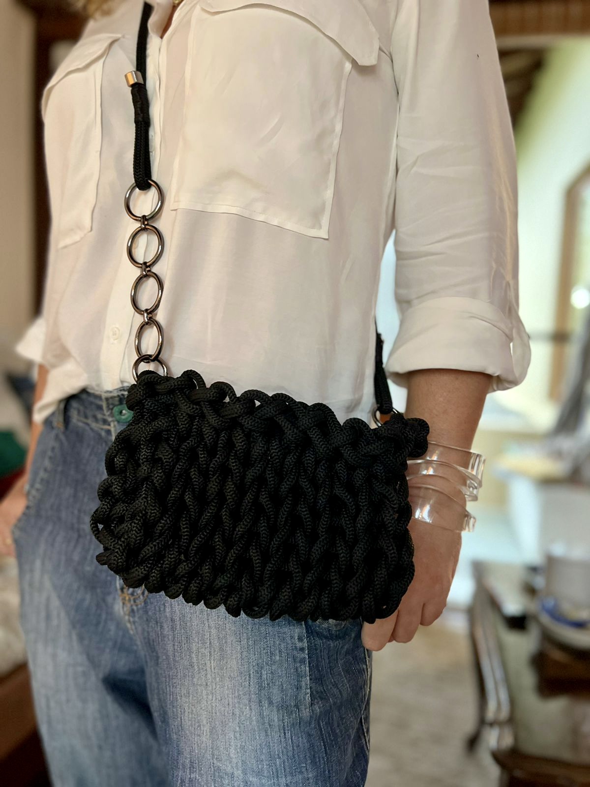 Bolsa Ganita preta vem com alça em corda e argolas de metal na cor grafite, que trazem modernidade e mais estilo para peça. Ela vale para o dia e para a noite, combinando com looks casuais e despojados.