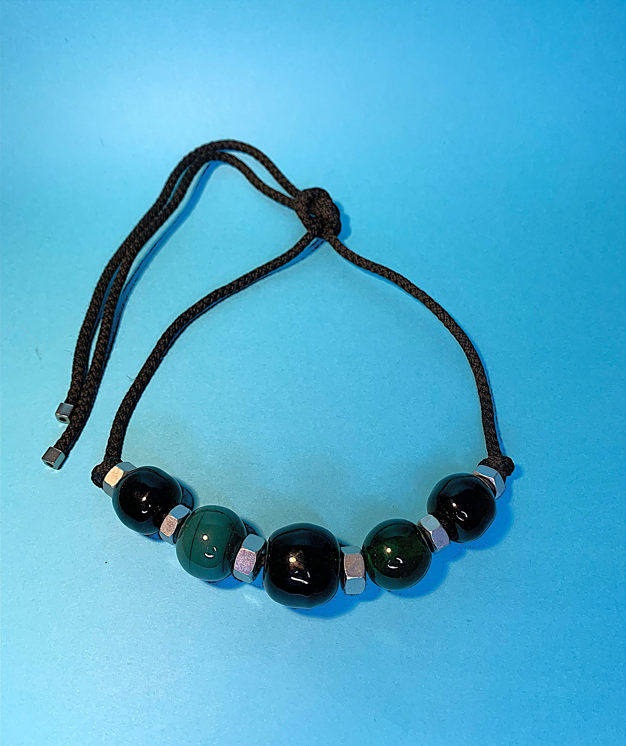 Colar Moniká em bolas de resina preta e verde, complemento em rosca de metal prata, fechamento em corda preta com ponteira de metal prata.