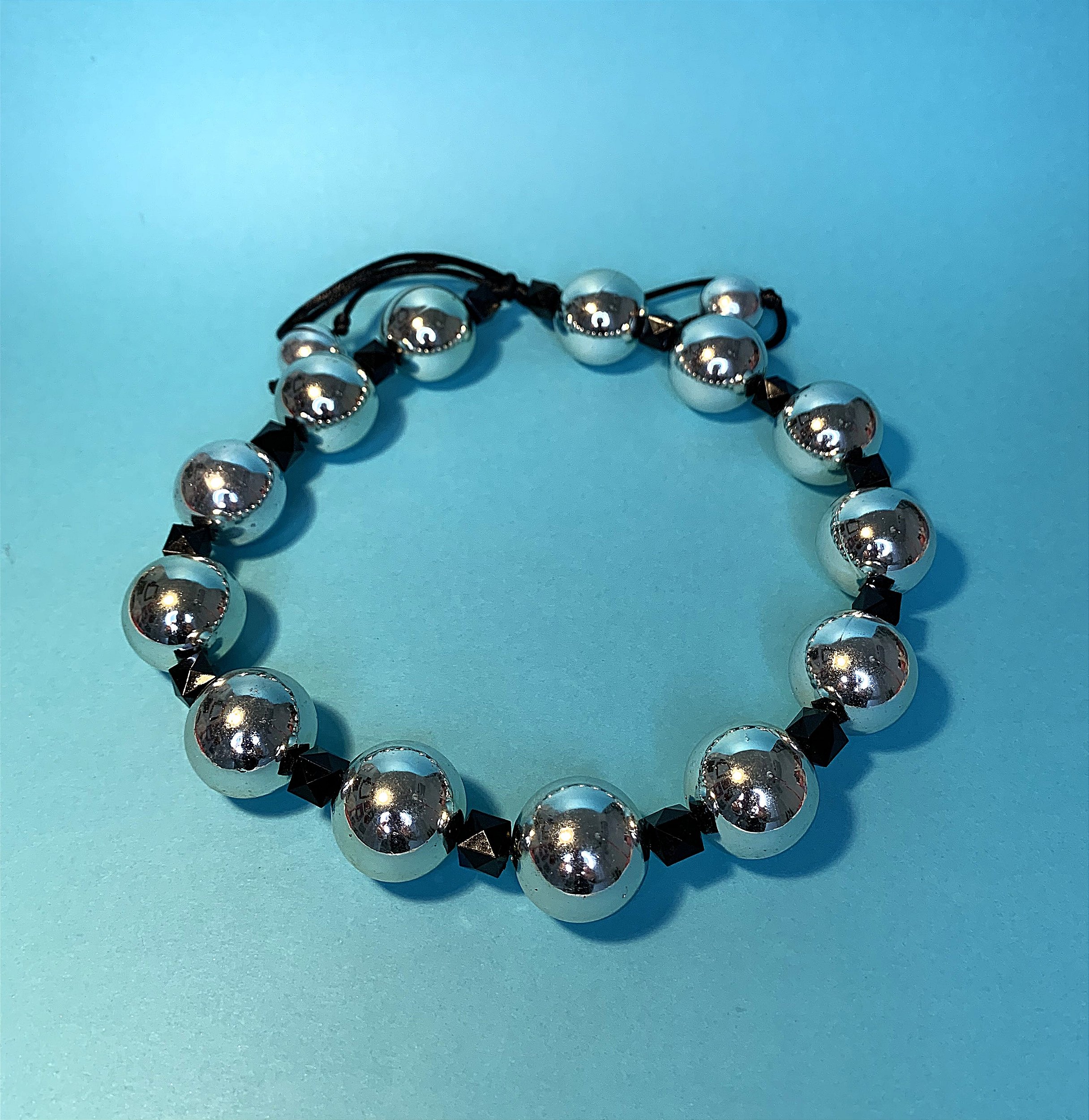 Colar Valerie em bolas de resina prateada, complemento em resina geométrica preta.