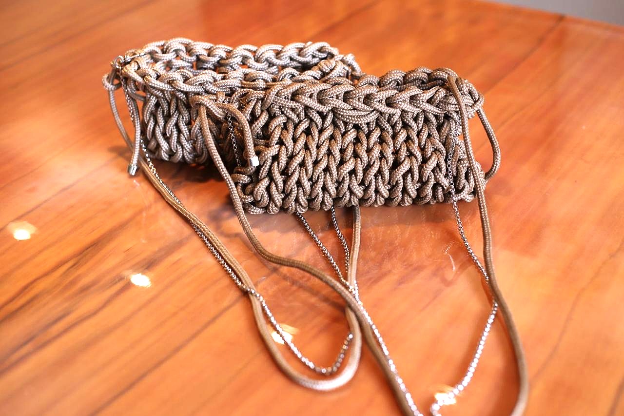 Ganita, em trama Fustam, na cor chocolate, produzida com uma corda mais fina (versão de cor mais escura).